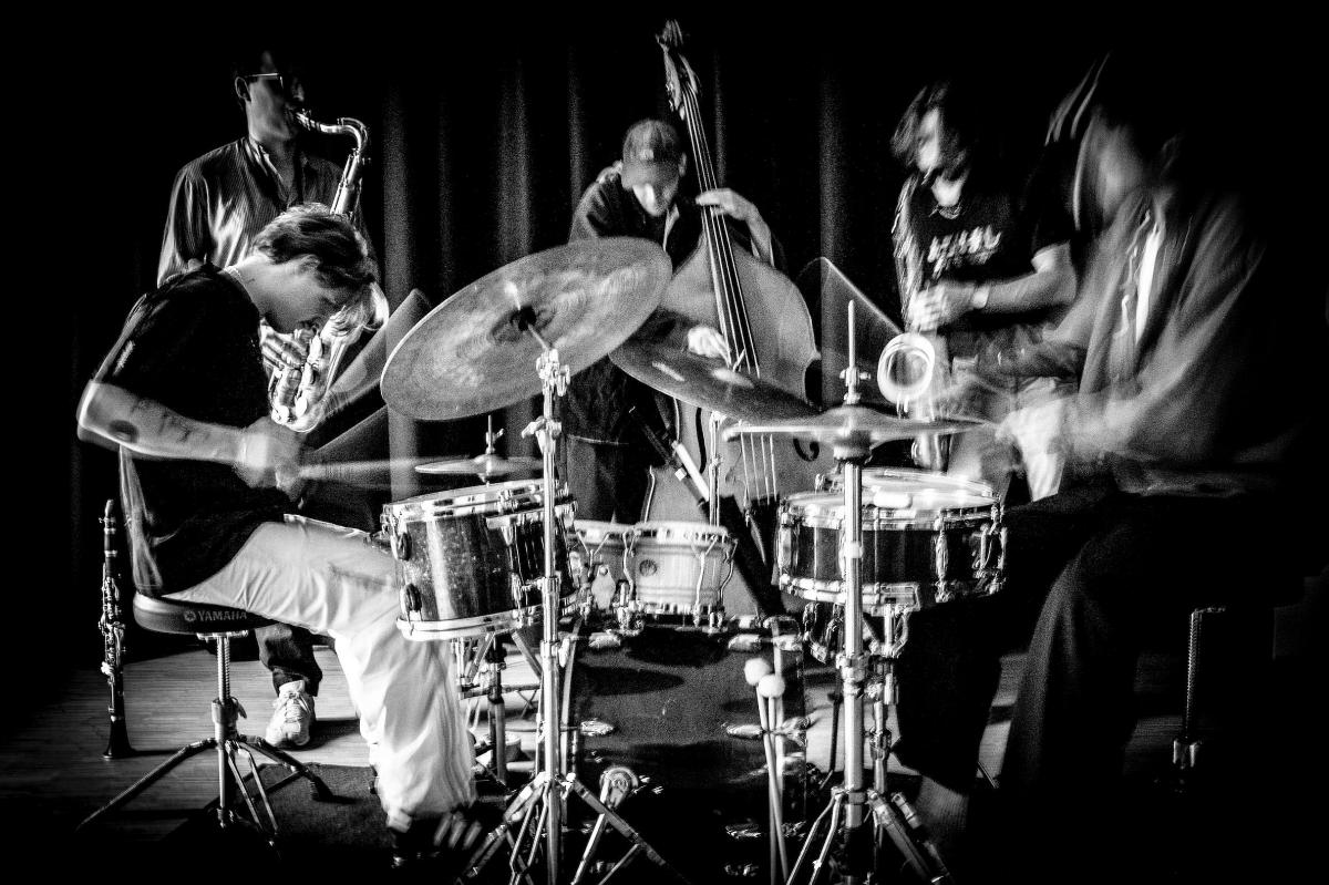 The sound of old hollow wood with gut strings, dry clarinets, piercing flutes, rumbling drums, and roaring saxophones; music that can both thunder and gently caress in the same gesture. The quintet—two saxophonists, two drummers, and a bassist—often divides into shifting duos and trios, yet always reunites around the ensemble sound: the sound of the group as one.
