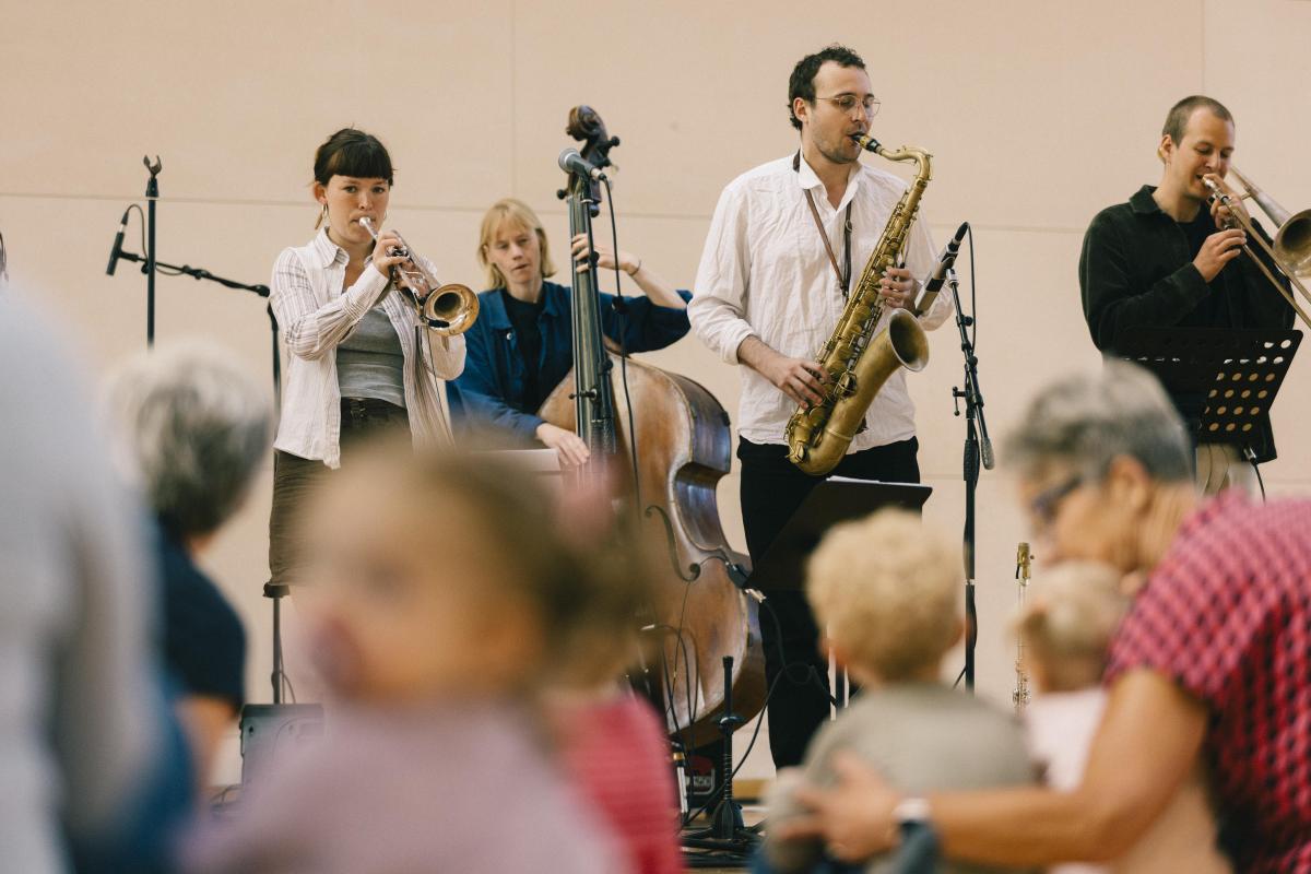 On stage is a vibrant lineup of trumpet, trombone, saxophone, guitar, double bass, drums, and vocals, ready to take children aged roughly 3 to 10 – and their families – on a jazzy adventure. Come along!