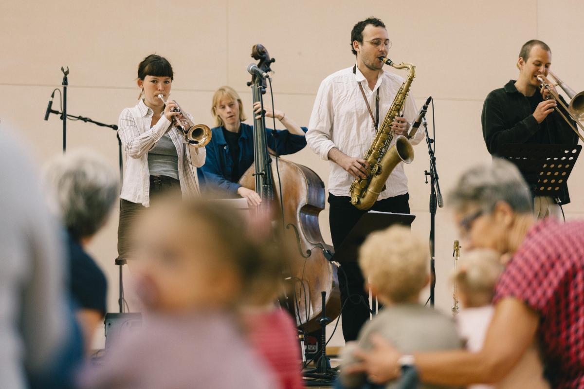 På scenen står en forrygende besætning af trompet, trombone, saxofon, guitar, kontrabas, trommer og vokal, klar til at tage børn fra ca. 3 til 10 år – og deres familier – med på en jazzet eventyrrejse. Kom med!